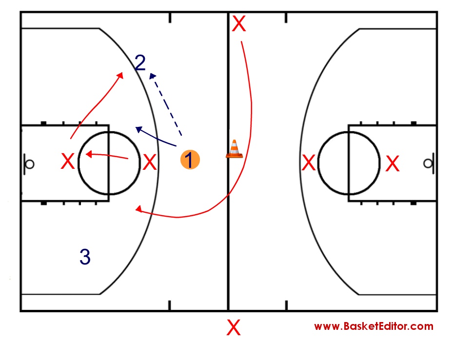 Cuando el balón pasa el centro del campo, se incorpora el nuevo defensor desde la posición de medio campo. convirtiéndose una situación de tres contra dos en una situación de tres contra tres. Respecto a la dinámica del ejercicio, los tres jugadores que defienden, pasan a atacar a la canasta contraria.
