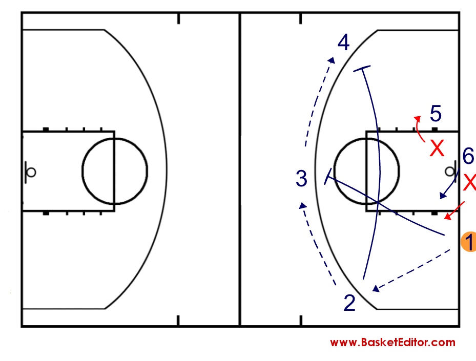 En mi etapa como entrenador ayudante de mi gran amigo Juanma Pino en los equipos junior y EBA de Cajasol, lo utilizábamos de forma recurrente. Lo cierto es que con este ejercicio conseguíamos gran intensidad y su dinámica nos daba mucho juego para trabajar diferentes situaciones. El jugador 1 pasa a 2 y va a defender a 3. 2 una vez que ha recibido pasa a 3 y va a defender a 4 que recibe de 3. A partir de mandar el balón a 4, se incorporan al juego los jugadores 5, 6 y sus respectivos defensores, provocando la situación final de cuatro contra cuatro. A partir de aquí, jugamos tres ataques: en esta canasta, más ida y vuelta.