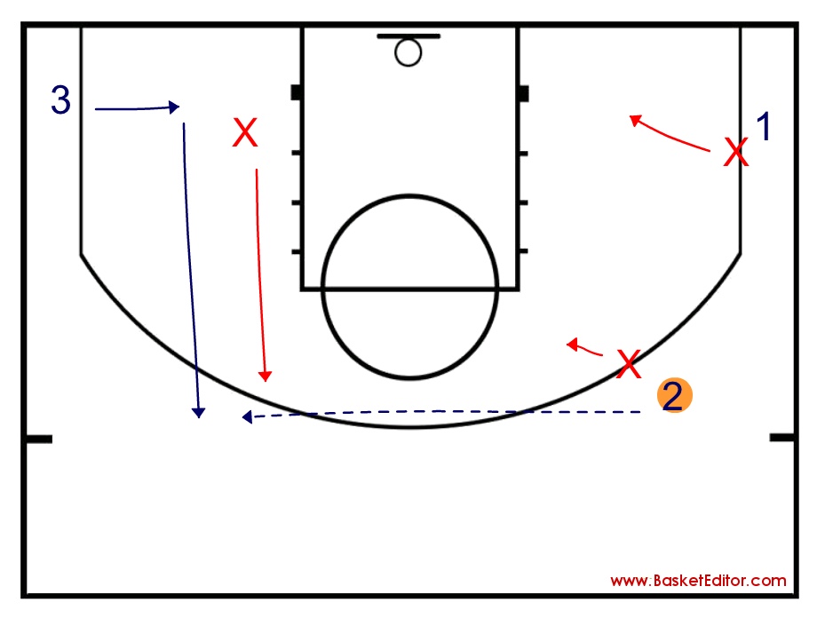 Ejercicio de cortes y defensa de los mismos en una situación tres contra tres. 1 pasa a 2 y corta a ocupar el espacio libre. Es importante trabajar con el defensor de 1, el que salte a la vez que el balón sale de las manos de 1, evitando que su primer gesto sea el de mirar a 2.