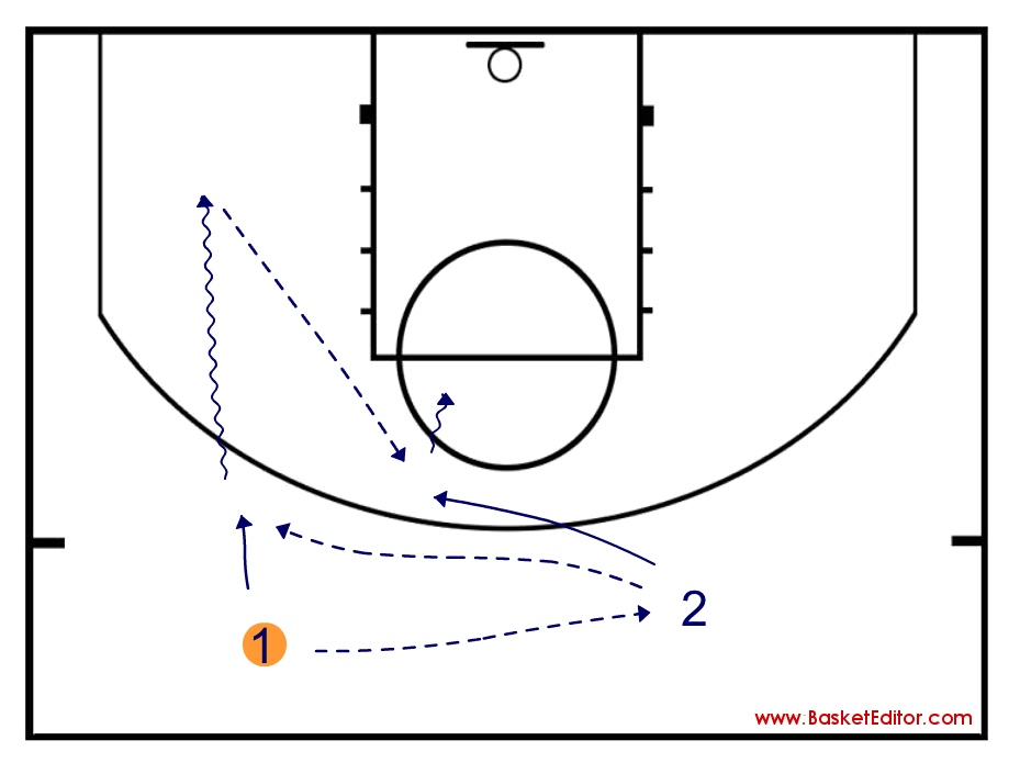 El jugador con balón 1, pasa a 2 y este se lo devuelve. Cuando 1 vuelve a recibir el pase de vuelta, penetra » tirando » de 2, el cual ofrece una línea de pase para 1. A partir de la recepción, 2 puede tirar, penetrar a canasta …