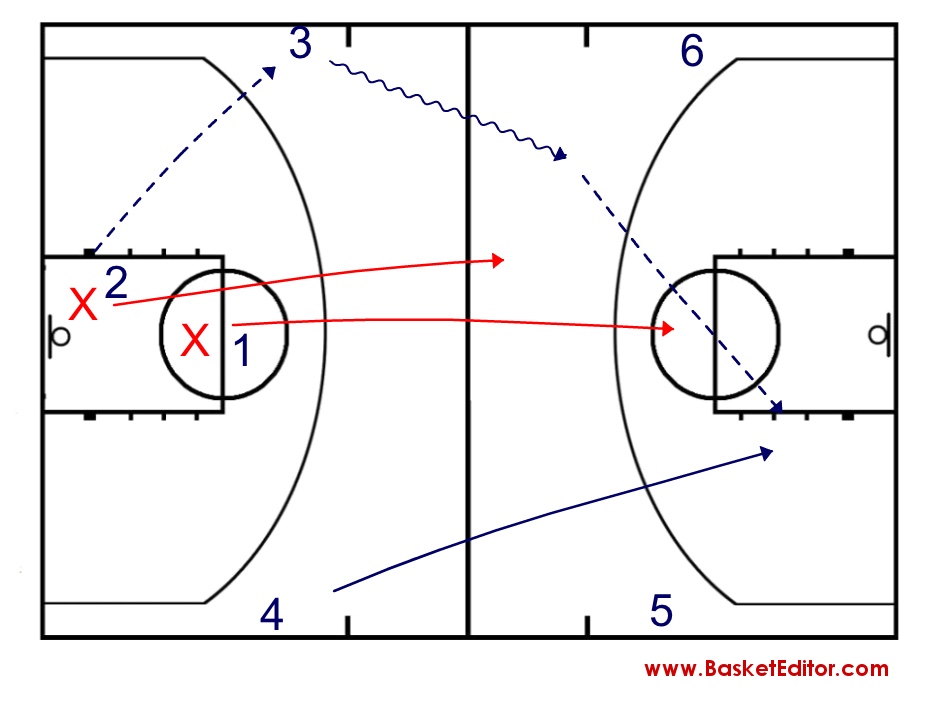 Trás canasta o pérdida de balón, los atacantes 1 y 2 rápidamente pasan a defender a 3 y 4, uno de los cuales previamente ha recibido pase de los defensores. Podemos poner diferentes objetivos: defender el primer pase, » llenar la zona » para evitar bandejas, » saltar y cambiar » …