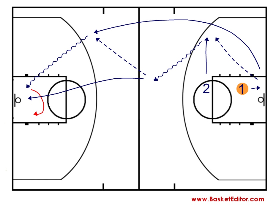 A partir del tradicional ejercicio de primer pase de contraataque, incluimos una situación de uno contra uno en toda la cancha. 1 tras entrar a canasta, pasa a defender a 2. Además de trabajar con el defensor las diferentes formas de defender al balón según la distancia a la canasta, me gusta trabajar el concepto de «brazos arriba»; es decir si en algún momento al defender pierde la distancia y se pega al atacante levantar los brazos y evitar la tentación de ir a robar el balón encadenando errores y provocando faltas innecesarias.