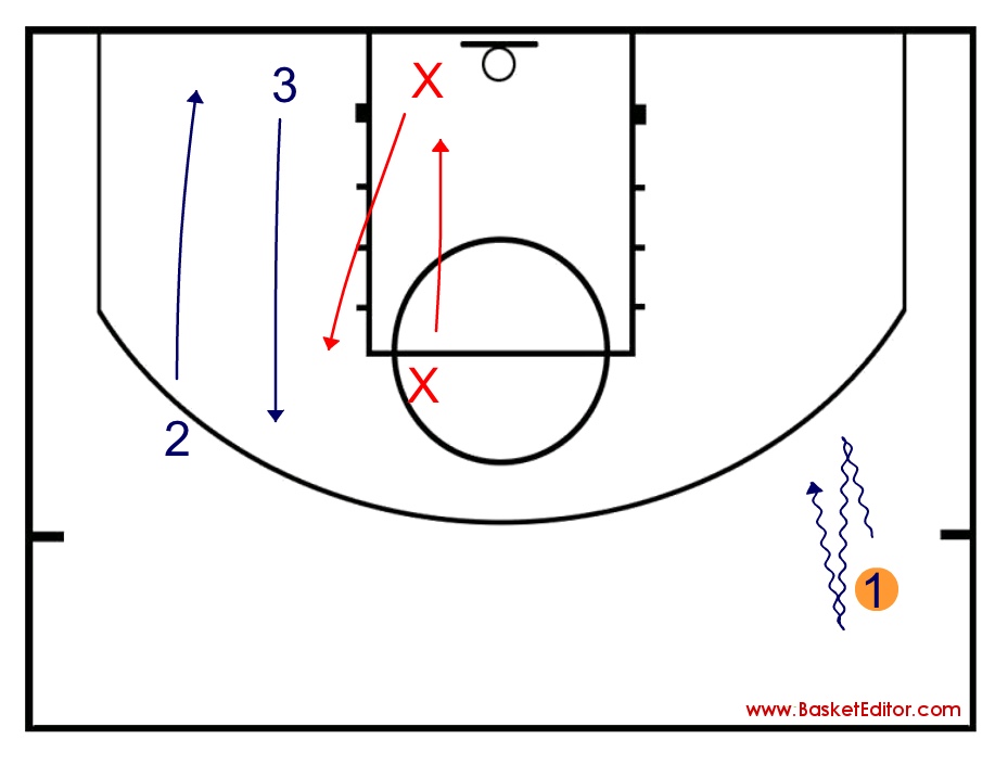 El jugador 1 con balón ( si tenéis ayudante, yo lo pondría en lugar de 1 ), inicia entrada y retroceso mediante bote. A la señal de » cambio «, 2 y 3 intercambian posiciones obligando a sus defensores a ajustar la posición defensiva. El defensor del jugador que cae a línea de fondo, coloca los pies orientados perpendicularmente a la línea de fondo.