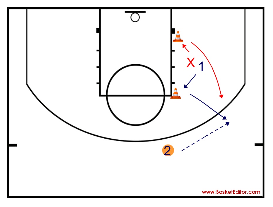 Al plantear ejercicios cuyo objetivo es la toma de decisiones, pongo especial énfasis, en que tomen la decisión en el menor tiempo posible, aún a costa de que la decisión tomada no haya sido la mejor de las posibles. En este caso, la dinámica del ejercicio consiste en una situación de uno contra uno, en la que el atacante antes de recibir tiene que tocar un pivote. El defensor, antes de ir a defender, habrá de tocar el pivote contrario. Esta ventaja, es la que deberá aprovechar 1 para leer la defensa y tomar la mejor decisión: tirar, salir por la izquierda, jugar al contrapie …