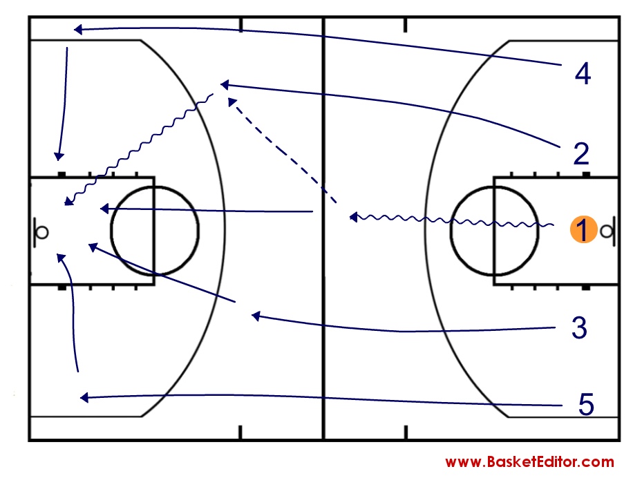 Podemos trabajar por oleadas o montar distintas variables: vuelta 5×0; vuelta 3×2; vuelta 3×2 mas uno, haciendo que el que entro a canasta tenga que tocar línea de fondo antes de volver a defender …