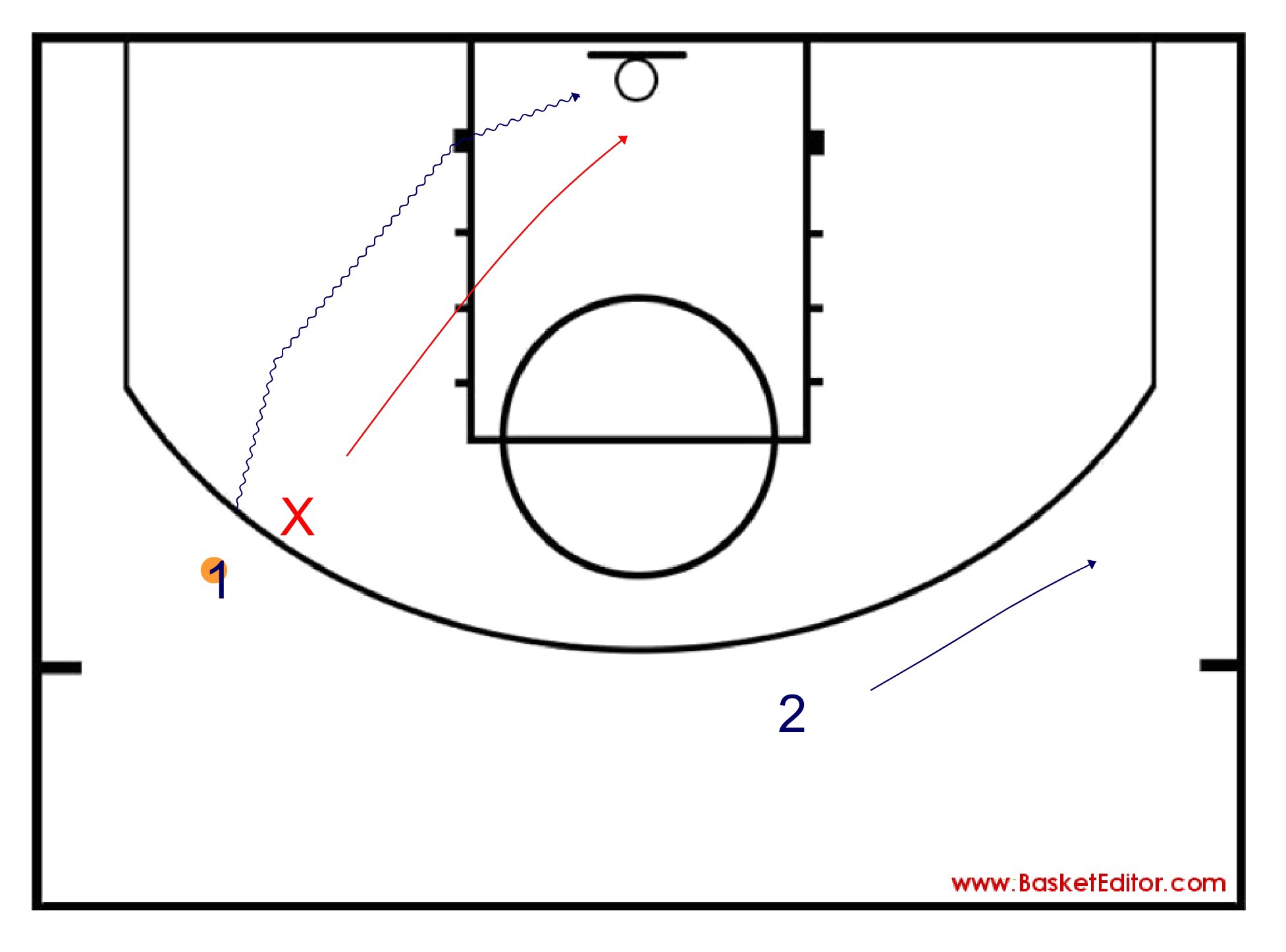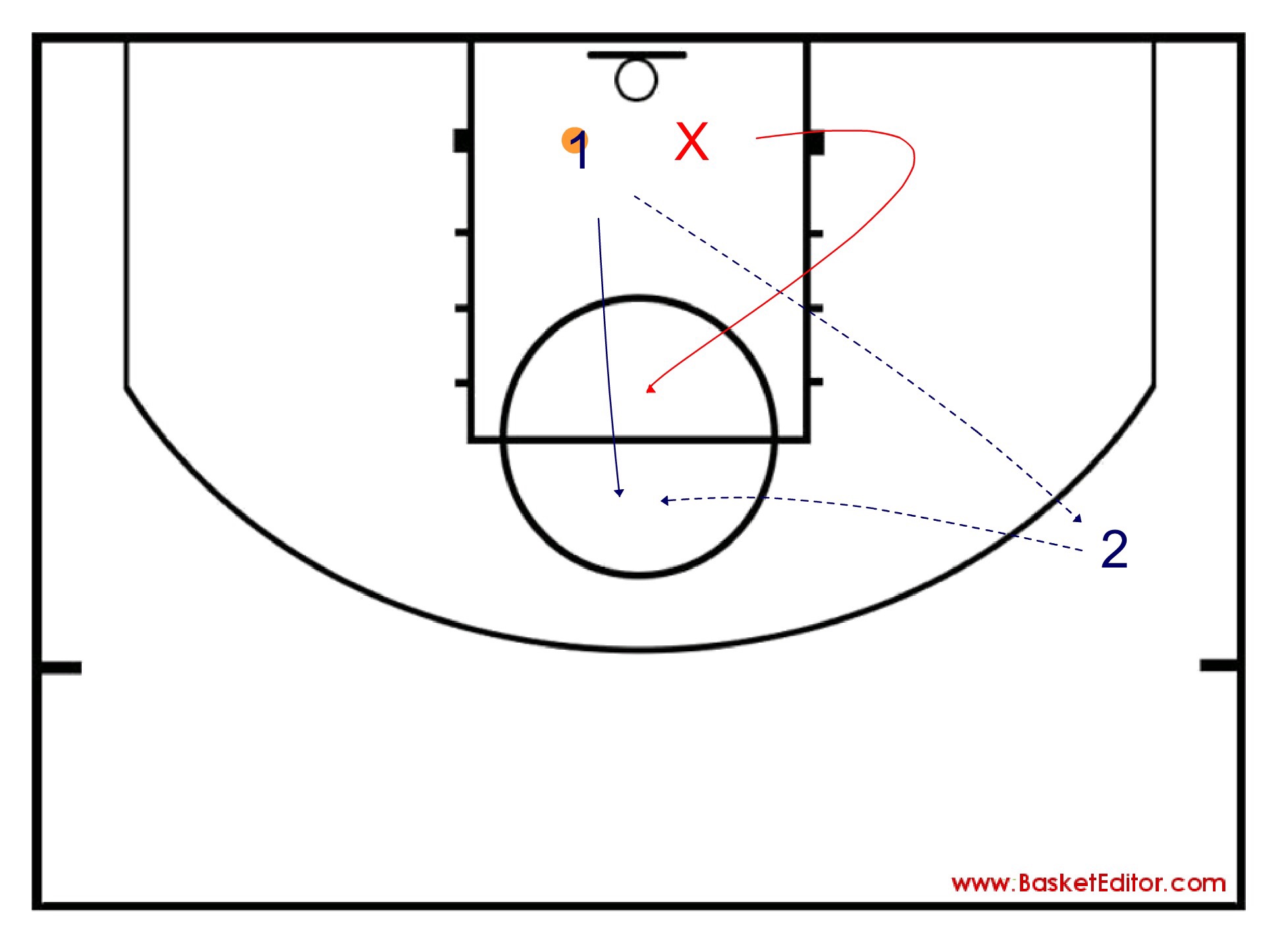 El reboteador, o 1 si consiguió anotar, da pase a 2 y sale de la zona para recibir pase de vuelta. Aquel que tiene que defender, antes de ir a defender, deberá pisar la zona por un lateral que no sea por el que salió el atacante.