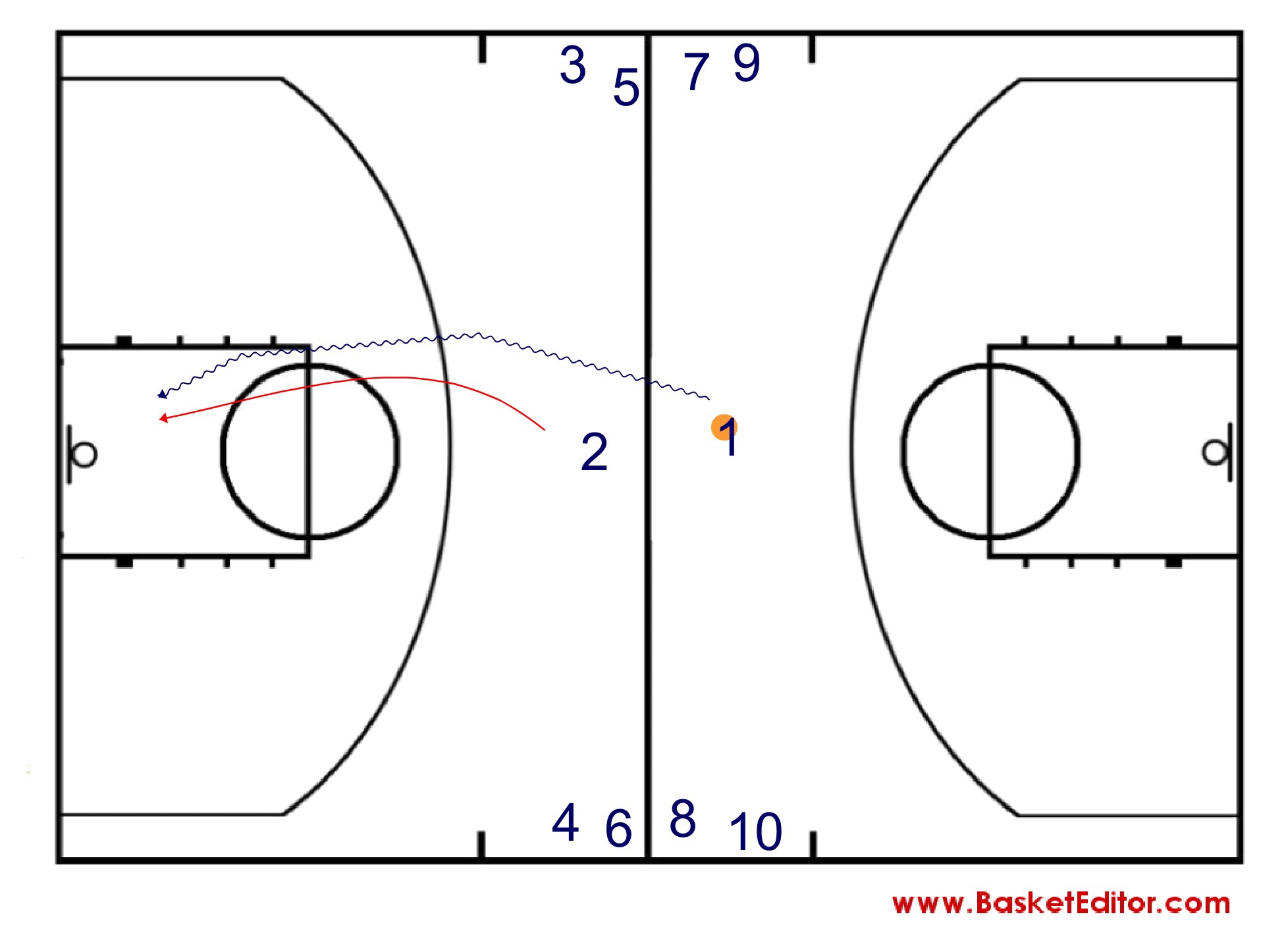 Cuando 1y2,han finalizado, se incorporan al juego un jugador de cada grupo, asumiendo uno el rol de atacante, en este caso el jugador 4 y otro el rol defensivo, en este caso el jugador 3, jugándose una situación de 2×2 en la canasta contraria.