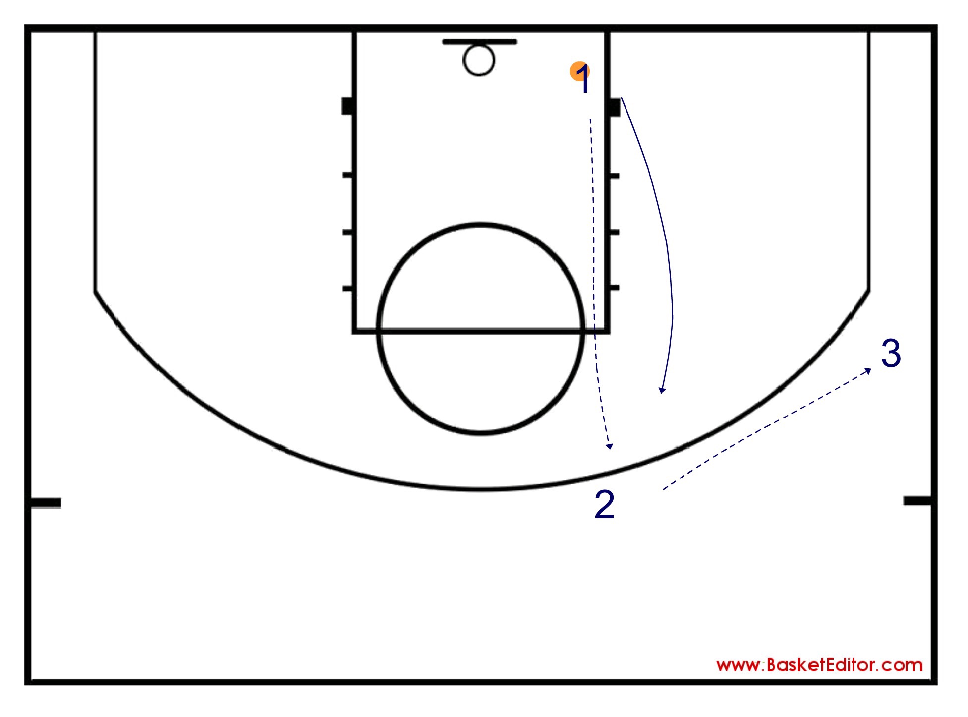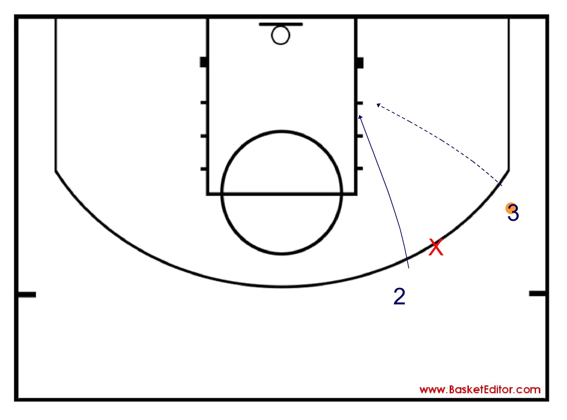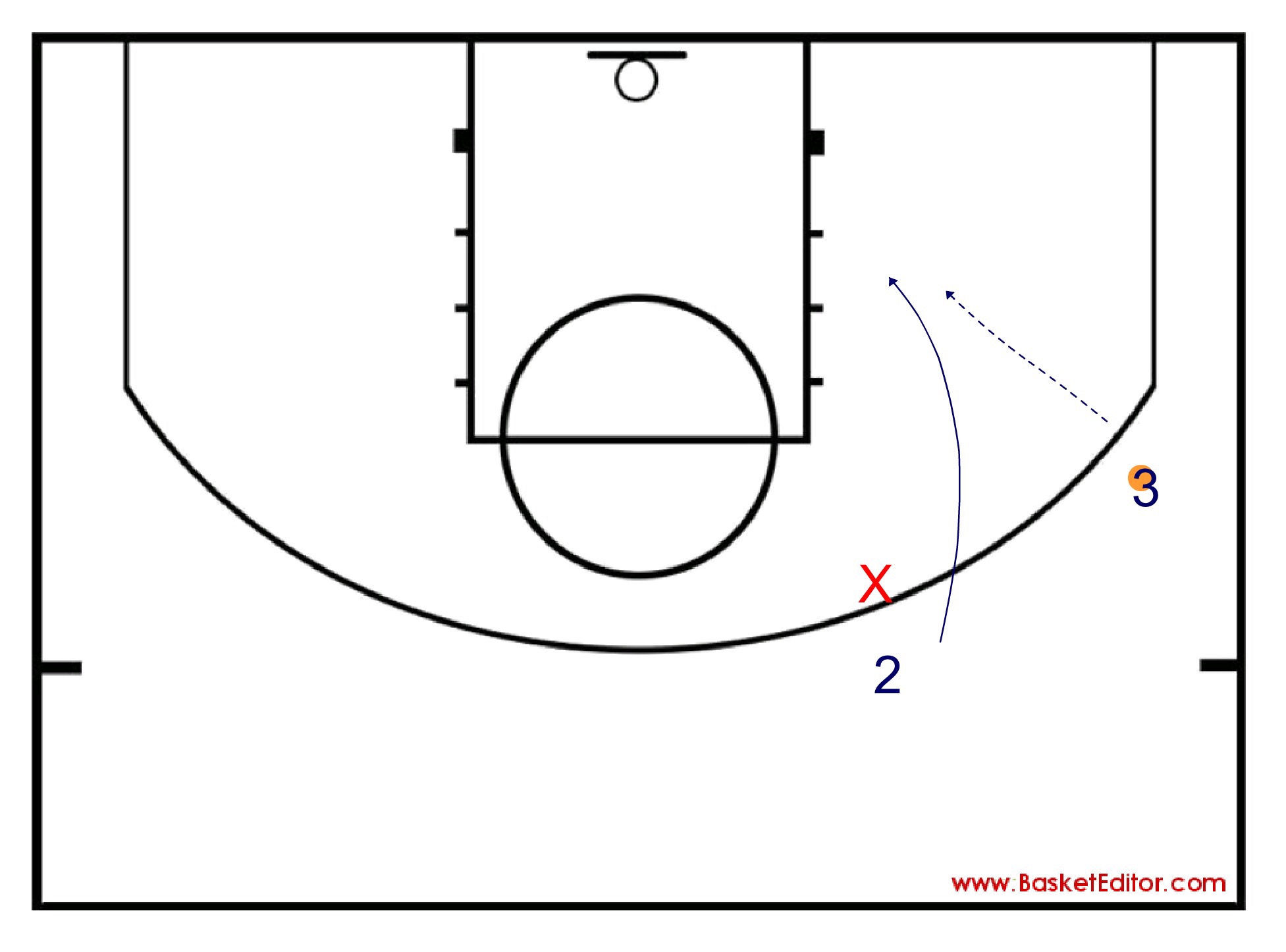 Si tras tras el pase de 2 a 3, el defensor no salta al balón, el corte lo realizamos por delante.