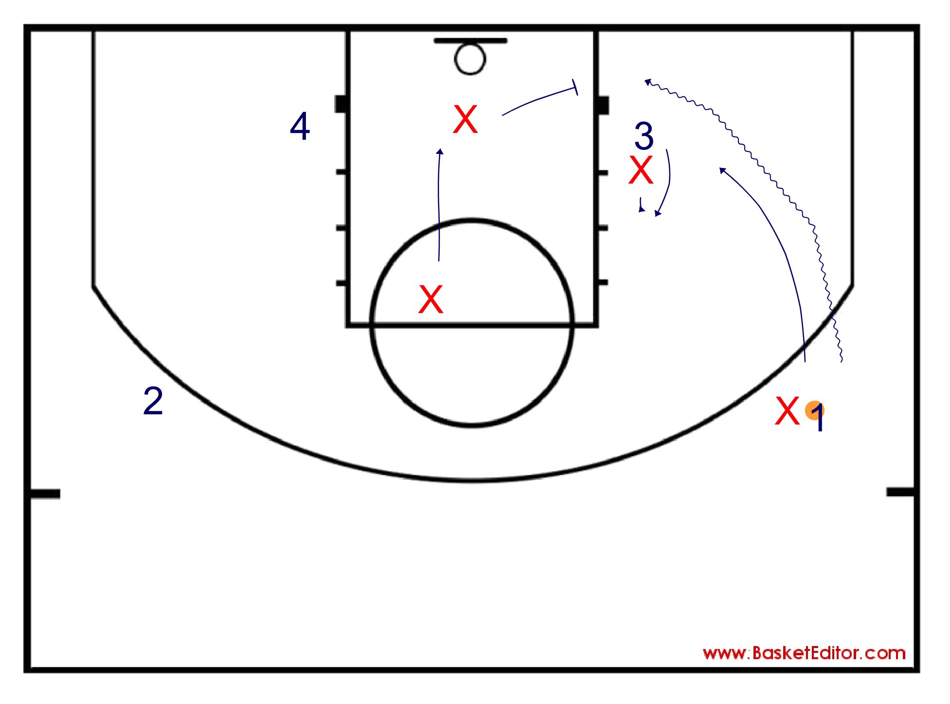 En una situación de 4 contra 4, el jugador 1 con balón, realiza una penetracion a canasta. Su defensor, le da un bote de ventaja. El poste 3, del lado balón sube para facilitar la penetracion de 1. El defensor de 4 hace la primera ayuda y el defensor de 2 la segunda ayuda. 1 da pase exterior a 2 y a partir de aquí recuperaciones y juego 4×4.